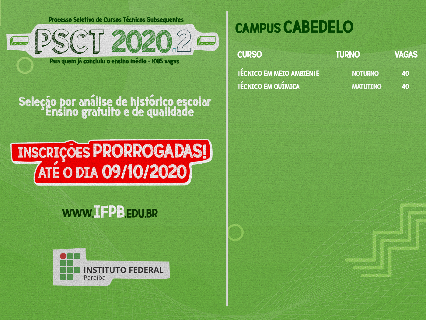 Inscrições para os Cursos Técnicos Subsequentes do IFPB são prorrogadas