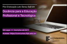 Continuam abertas as inscrições para o Curso de Pós-Graduação Lato Sensu em Docência para a Educação Profissional e Tecnológica ofertado pelo Instituto Federal da Paraíba. Estão sendo oferecidas 500 vagas no curso de Especialização na modalidade de Educação à Distância (EaD). O período de inscrição se encerra em 4 de novembro (quarta-feira).