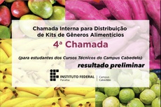 O Campus Cabedelo divulgou na tarde de hoje (16) o resultado preliminar da Chamada Interna 04/2020, de distribuição de kits de gêneros alimentícios in natura e minimamente processados adquiridos com recursos do Programa Nacional de Alimentação Escolar (PNAE). Os produtos que compõem os kits foram adquiridos diretamente da Agricultura Familiar.