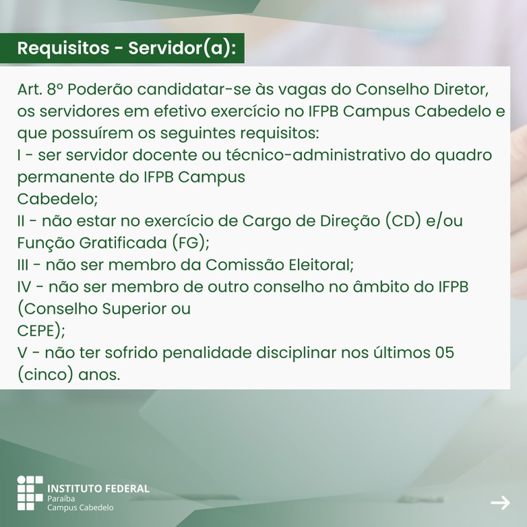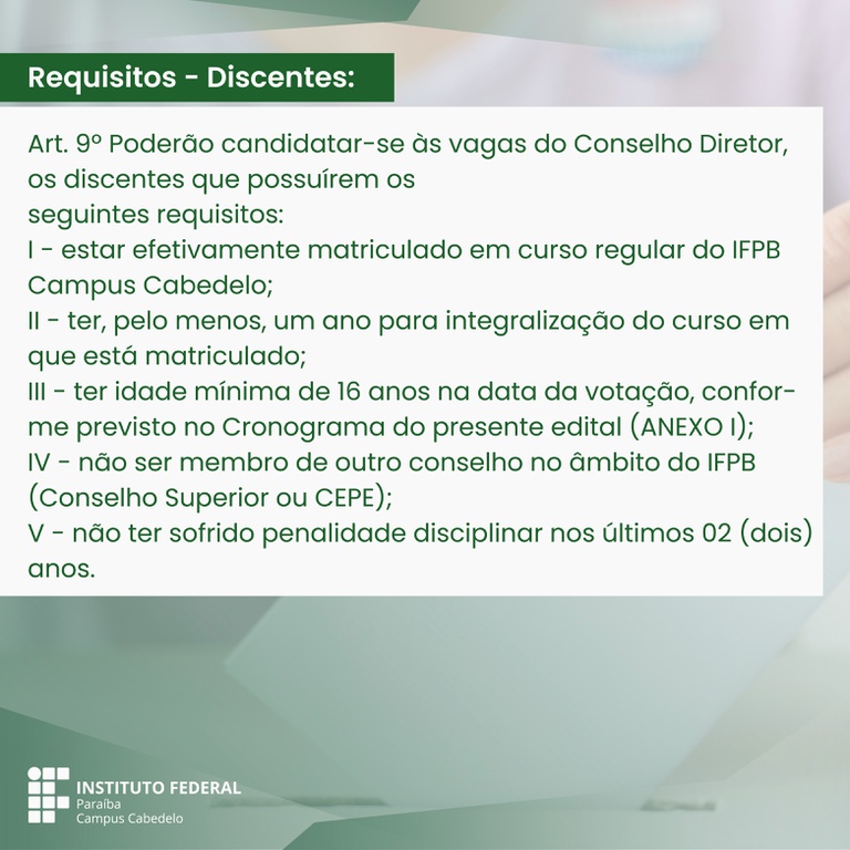 Você está aqui: Página Inicial > Cabedelo > Notícias > 2024 > 02 > Publicado edital de eleições para membros do Conselho Diretor do IFPB Campus Cabedelo