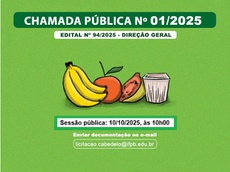 A Comissão Especial de Compras da Agricultura Familiar (CECAF) reagendou para o dia 10 de outubro de 2025, às 10 horas, a sessão pública prevista no Edital 94/2025-Direção Geral, que trata da aquisição de gêneros alimentícios diretamente da Agricultura Familiar e do Empreendedor Familiar Rural.