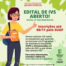 O Campus Cajazeiras, por meio da Coordenação de Apoio ao Estudante (CAEST), abriu o edital Nº 25/2020 de análise ou reanálise do índice de vulnerabilidade socioeconômica. Concebe-se, para os fins deste edital, vulnerabilidade social como expressões da questão social, relacionadas ao empobrecimento da classe trabalhadora. O IVS é o critério principal para classificação e seleção dos estudantes para atendimento pelos Programas da Política de Assistência Estudantil do IFPB.