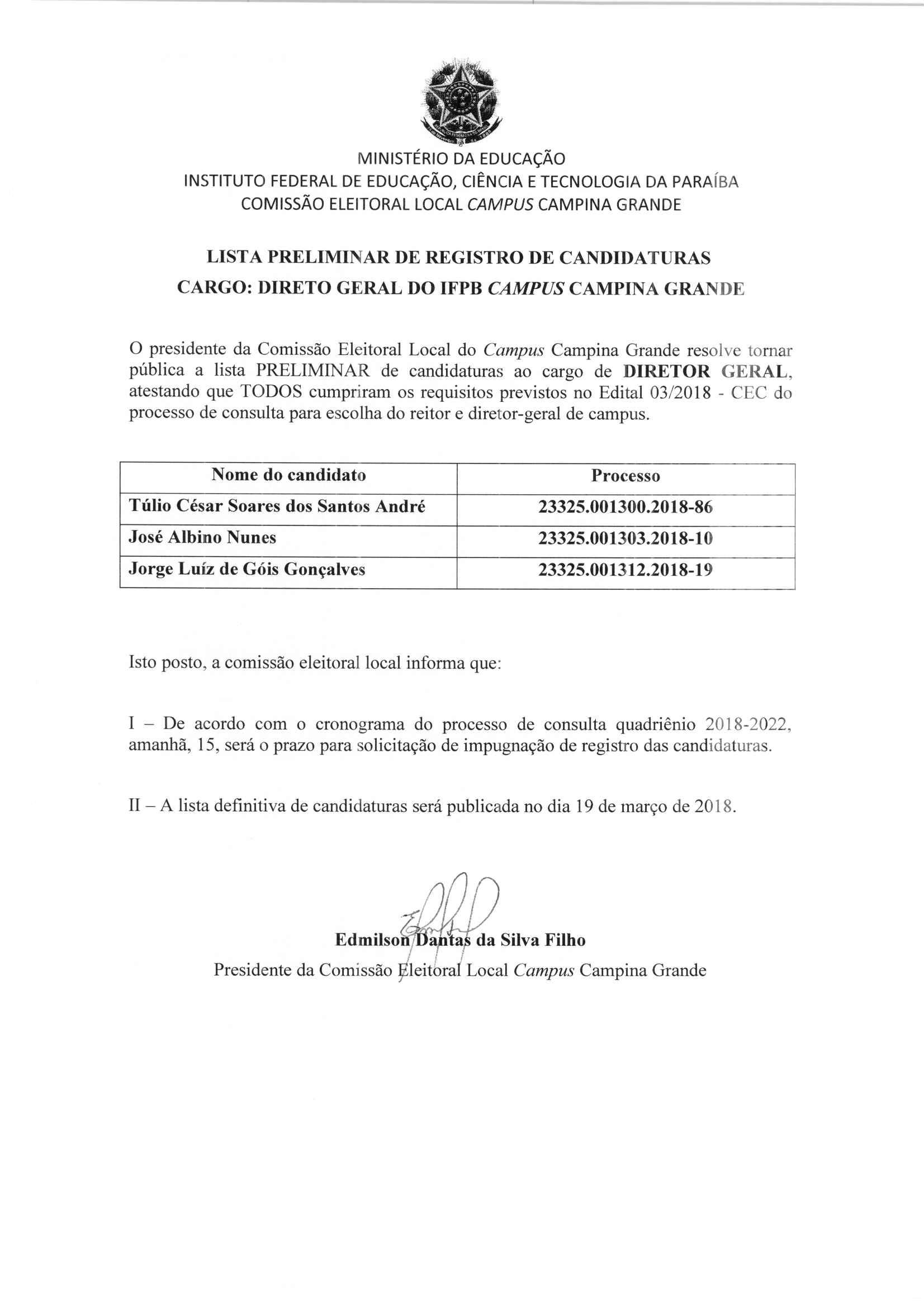 | Lista Preliminar dos Candidatos | Lista preliminar de registro de candidaturas. | 14/03/2018 12h18 |