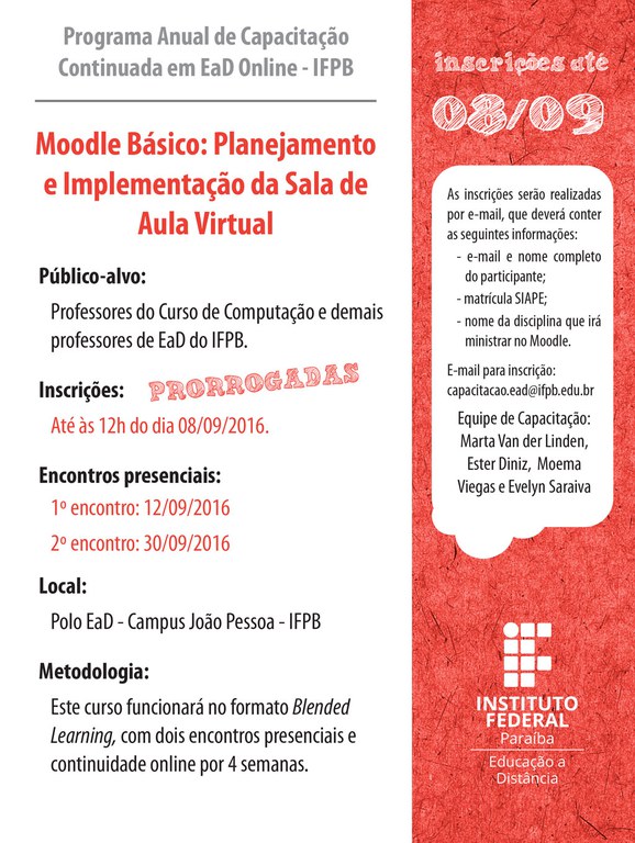 As inscrições para o curso, destinado aos professores de EaD do IFPB, seguem até o dia 9 de setembro de 2016.