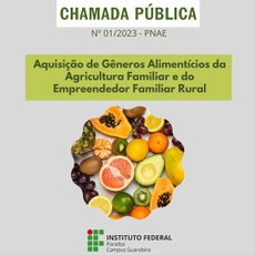 O Instituto Federal de Educação Ciência e Tecnologia - Campus Guarabira torna público o Edital de Chamada Pública nº 01/2023 para a aquisição de gêneros alimentícios para a composição de kits de alimentos da Agricultura Familiar e do Empreendedor Familiar Rural, em atendimento ao Programa Nacional de Alimentação Escolar – PNAE, para atender aos alunos matriculados na Educação Básica, conforme determina a legislação, durante o período de 2022. (Clique aqui e confira o edital).