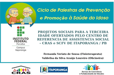 A palestra foi proferida pelas profissionais do Centro de Referência de Assistência Social - CRAS do município de Itaporanga/PB, Fernanda Veriato de Sousa (Fisioterapeuta) e Valdeilsa da Silva Loureiro (Oficineira). As palestrantes destacaram algumas das ações desenvolvidas pelo CRAS, a destacar: Bailes de Carnaval e Semana do Idoso, apresentações Juninas e Natalinas, Atividades físicas envolvendo alongamentos; fortalecimentos; treino de equilíbrio, coordenação e agilidade, rodas de conversas com acompanhamento de psicólogos, campanhas sócio educativas, recreações diversas (Adivinhação, jogos, música, gincanas, bingo), Encontros intergeracionais e intermunicipais, Interação social e fortalecimento de vínculos, Imunização nas campanhas do MINISTÉRIO DA SAÚDE, Entrega da caderneta do idoso, dentre outras.