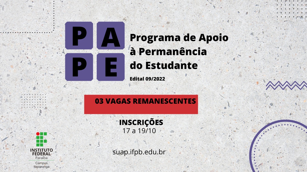 IFPB campus Itaporanga divulga Edital de vagas remanescentes do Programa de Apoio à Permanência do Estudante (PAPE)