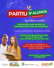 O Campus Itaporanga, por meio da Diretoria de Desenvolvimento de Ensino, convoca para Entrega da Documentação para Pré-Matrícula os candidatos inscritos do Programa Partiu IF, nas vagas ofertadas pelo campus. Os candidatos que encontram-se na LISTA DE CONVOCADOS PARA PRÉ-MATRÍCULA terão os dias 04, 07 e 08 de abril, nos horários de 08h as 12h e de 13h as 15h para comparecer no campus e realizar a entrega presencial de toda a documentação necessária.