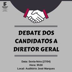 Nesta sexta-feira (27), a partir das 9h30, no auditório José Marques, acontecerá o debate dos candidatos a Diretor Geral do campus João Pessoa para o quadriênio 2018-2022. A votação será realizada no próximo dia 03 de maio.