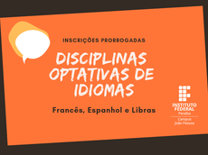 A Coordenação de Linguagens, Códigos e suas Tecnologias (CLCT) prorrogou as inscrições de alunos dos cursos Técnicos Integrados nas disciplinas optativas de idiomas. Há vagas para Francês, Libras e Espanhol. As inscrições são realizadas até amanhã (19), presencialmente, na sala 19 (1º andar), no horário das 8h às 16h.