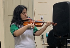 Para a docente, esse crescimento também veio com a participação da estudante na Orquestra de Cordas do IFPB-OCIFPB. Tatiane foi a primeira aluna com deficiência que se interessou em participar da orquestra. “Como coordenadora do grupo, eu me perguntei: por que não? Ela tem direito de participar e o grupo tem que acolhê-la”, comentou Marina. Foi necessário fazer algumas adaptações para que isso acontecesse: foi o naipe de 3º violino e produzidas partituras mais facilitadas e ampliadas, porque Tatiane também tem baixa visão.