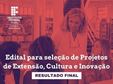 O Campus João Pessoa divulgou, nesta quinta-feira (02), o resultado final da seleção Projetos de Extensão, Cultura e Inovação dos Programas Institucionais de Bolsas, que é destinado a servidores e discentes. Acesse aqui o resultado.