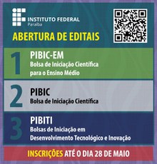 A Pró-Reitoria de Pesquisa, Inovação e Pós-Graduação (PRPIPG) divulgou os editais para a oferta dos programas institucionais de Bolsa de Iniciação Científica para o Ensino Médio (PIBIC-EM), Bolsa de Iniciação Científica (PIBIC) e Bolsas de Iniciação em Desenvolvimento Tecnológico e Inovação (PIBITI). Os dois últimos são destinados a estudantes do Ensino Superior.