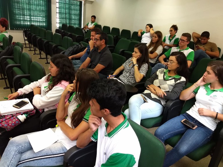 Direção Geral, Direção Administrativa, Direção de Ensino, Coordenadores dos Cursos Técnicos e Formação Geral participam de reunião com estudantes representantes de turma.