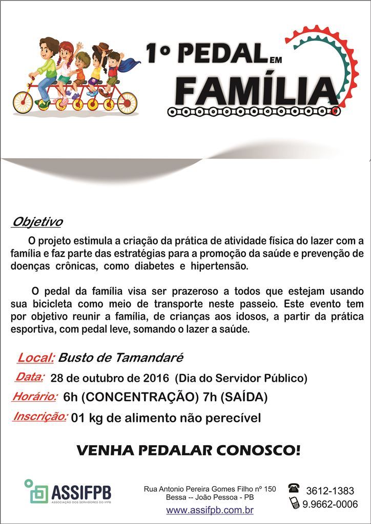 Logo cedo acontecerá o 1º Pedal em Família com concentração a partir das 06h no Busto de Tamandaré. Antes da largada às 07h os participantes terão o apoio de uma equipe para verificar pressão arterial e testes de glicemia. Também será montada uma mesa com frutas no local. O passeio ciclístico vai até a Sede Social (Clube no Bessa). Para participar basta levar um quilo de alimento não perecível. Confira nesse link o convite.