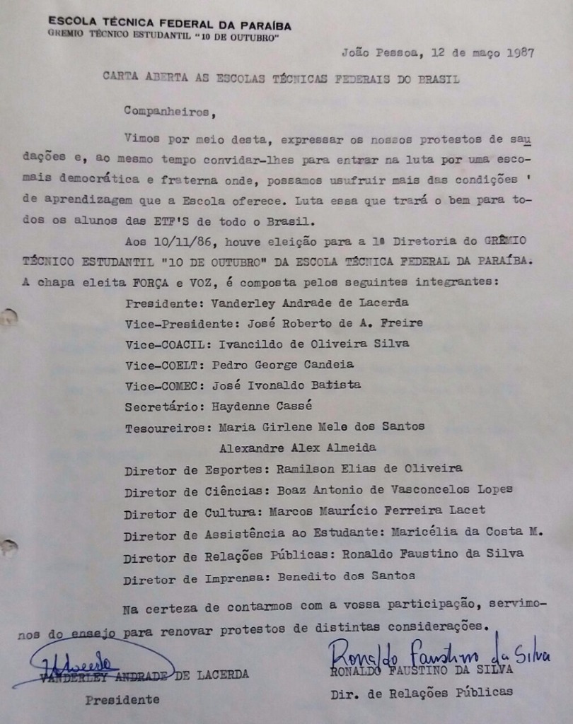 Sabe-se que as informações sobre o Movimento Estudantil no Instituto Federal de Educação Ciência e Tecnologia da Paraíba (IFPB) são ainda escassas. Apesar de ser uma instituição centenária, somente nos últimos anos uma política consistente de preservação da memória institucional foi efetivamente levada a cabo pela atual gestão do reitor Nicácio Lopes, com a organização do Núcleo de Documentação e Pesquisa da Educação Profissional. A documentação disponível sobre o assunto, “guardada” durante décadas pelos estudantes, hoje encontra-se devidamente organizada e sob a guarda do NDPEP.