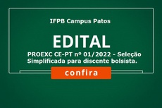 O Instituto Federal da Paraíba, campus Patos através da Direção Geral e da Coordenação de Extensão e Cultura torna-se público o resultado preliminar da seleção para bolsista interessado em atuar nos projetos de extensão do Edital PROEXC CE-PT nº 01/2022, de Seleção Simplificada para discente bolsista de Projeto de Extensão.