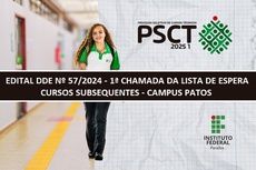 O Instituto Federal de Educação, Ciência e Tecnologia da Paraíba – IFPB, Campus Patos, através da Diretoria de Desenvolvimento de Ensino e de acordo com as disposições da legislação em vigor, divulga por meio do Edital DDE nº 57/2024, as condições para manifestação de interesse em matrícula dos candidatos pré-classificados por meio da Lista de Espera do Processo Seletivo de Cursos Técnicos para preenchimento de vagas remanescentes nos Cursos Subsequentes ao ensino médio presenciais para o ano letivo de 2025.1, onde os candidatos de que trata este edital foram pré-classificados para os campi do IFPB por meio do PSCT 2025 - Edital Nº 113/2024, de 02 de Setembro de 2024 (e suas alterações posteriores).