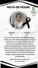 O Instituto Federal da Paraíba, Campus Patos manifesta o mais profundo pesar pelo falecimento de Maria Neuma Lima Candeia, mãe da professora Brígida Lima Candeia.