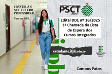 O Instituto Federal de Educação, Ciência e Tecnologia da Paraíba – IFPB, Campus Patos, através da Diretoria de Desenvolvimento de Ensino e de acordo com as disposições da legislação em vigor, faz saber através do Edital DDE nº 16/2025, as condições para manifestação de interesse em matrícula dos candidatos pré-classificados por meio da Lista de Espera do Processo Seletivo de Cursos Técnicos para preenchimento de vagas remanescentes nos cursos integrados ao ensino médio presenciais para o ano letivo de 2025, onde os candidatos de que trata este edital foram pré-classificados para os campi do IFPB por meio do PSCT 2025 - Edital Nº 112/2024, de 02 de Setembro de 2024 (e suas alterações posteriores).