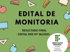 O Instituto Federal de Educação, Ciência e Tecnologia da Paraíba – IFPB, Campus Patos, por meio da Direção Geral, que no uso de suas atribuições estatutárias e regimentais, e da Diretoria de Desenvolvimento de Ensino, considerando o Estatuto do IFPB, a resolução CS nº 24/2019 que trata sobre o Plano Estratégico de Permanência e Êxito dos estudantes do IFPB e a Resolução AR 38/2022, que aprova o Programa de Monitoria do Instituto Federal de Educação, Ciência e Tecnologia da Paraíba (PROMIFPB), resolve tornar público o Resultado Final do Edital DDE nº 36/2025, do Programa de Monitoria do Instituto Federal de Educação Ciência e Tecnologia da Paraíba - PROMIFPB para o ano letivo 2025 e semestre letivo de 2025.1 para os cursos técnicos Integrados, de acordo com o que estabelece o presente Edital, gerenciado pela Comissão do PROMIFPB do Campus Patos (PROMIFPB-PT).