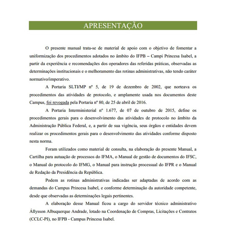 O Manual de Procedimentos visa fomentar a uniformização dos procedimentos adotados no âmbito do IFPB – Campus Princesa Isabel.