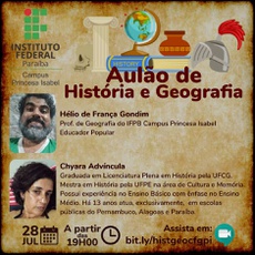 Os servidores do IFPB - Campus Princesa Isabel, Prof. Hélio Gondim e Profa. Chyara Advíncula, docentes de geografia e história, respectivamente, promoverão uma atividade remota vinculada ao Enem. Ambos tem experiências docentes na rede pública federal em vários estados do país, as quais trarão um melhor aproveitamento dos estudantes e interessados em participarem do aulão. A atividade é uma organização da Coordenação de Formação Geral e ocorrerá conforme informações abaixo:
