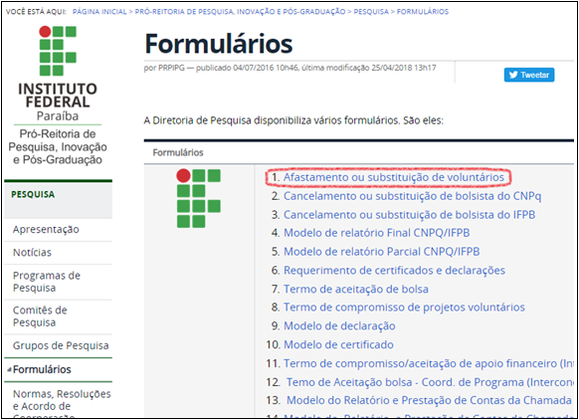 1. Preencher o formulário “Afastamento ou substituição de bolsista”. Disponível na página “Formulários” do site da Diretoria de Pesquisa.