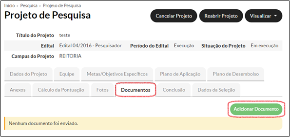 Outras informações: O deferimento da solicitação para quaisquer alterações será realizado pelo Coordenador de Pesquisa. Não será reconhecida pela PRPIPG/Coordenação de Pesquisa a inclusão de voluntários sem o prévio registro. Sendo assim, o Coordenador de Projeto deverá observar se sua solicitação foi deferida.