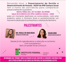 A palestra será ministrada pela Dra Pascalle de Sousa Rocha, enfermeira e servidora do IFPB Campus Sousa, e pela Rosana Dário, diretora executiva da empresa Mary Kay. O encontro discutirá a importância do autocuidado na prevenção contra o câncer de mama. Após as palestras, a programação seguirá com um momento dedicado à autoestima e a valorização feminina.