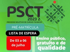 O período para realização da pré-matrícula dos candidatos aprovados pela lista de espera do Processo Seletivo de Cursos Técnicos Subsequentes (PSCT 2023.2) terá início nesta segunda-feira, 03 de julho. A pré-matrícula deverá ser efetuada de forma remota, através do Portal do Estudante, exclusivamente para o curso Técnico Subsequente em Agropecuária. O prazo final para a pré-matrícula é o dia 06 de julho.